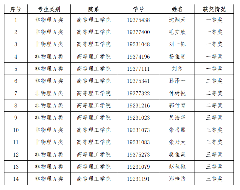 2020年北京航天航天大学大学生物理竞赛于10月24日在两校区同步顺利举行,近千人参加了考试,共有156人获奖,其中一等奖31人,二等奖38人,三等奖87人。现将高等理工学院获奖名单公布如下: