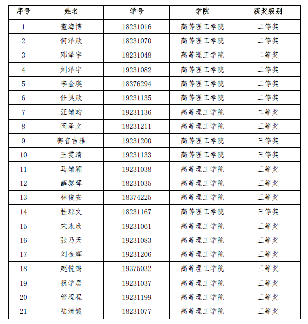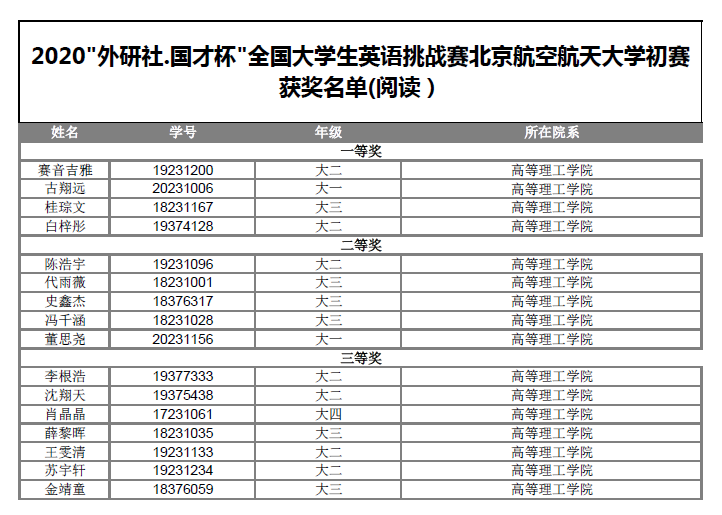 2020年全国大学生英语竞赛决赛(北京赛区)高等理工学院获奖名单如下: 此获奖名单已在教务处网站公布。