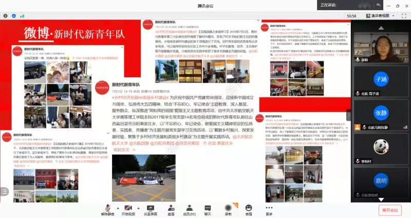 (转自北航新闻网)为进一步提升全媒体时代大学生媒介素养,增强大学生思政思维和思政能力,提高学生骨干宣传思想工作能力,2020年11月20日晚,北航高等理工学院、外国语学院等学院本科生、光电所博士生党支部党员骨干联合中国人民公安大学研究生,通过腾讯会议开展了“大学生媒介素养”专题系列讲座第四期活动。讲座由活动发起人、马克思主义学院青年教师张静主持,设置与谈人交流环节。