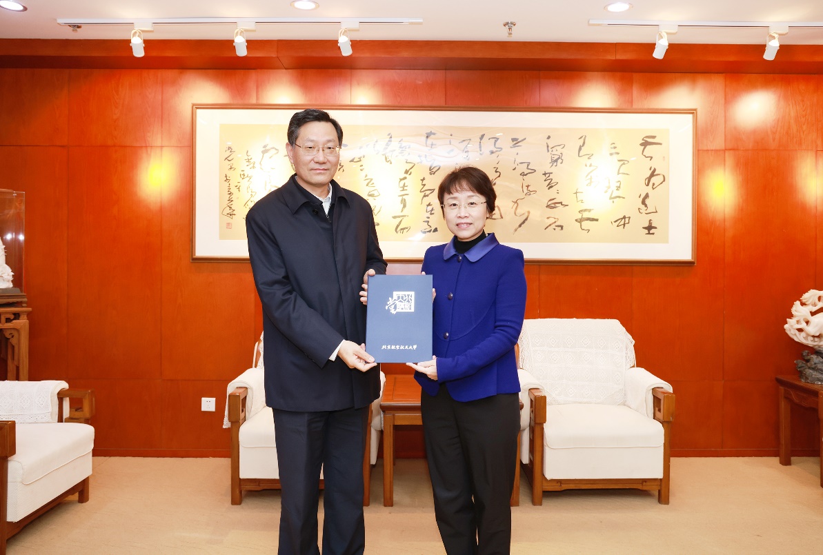 校党委书记曹淑敏为王巍院士颁发“北航大讲堂”荣誉证书