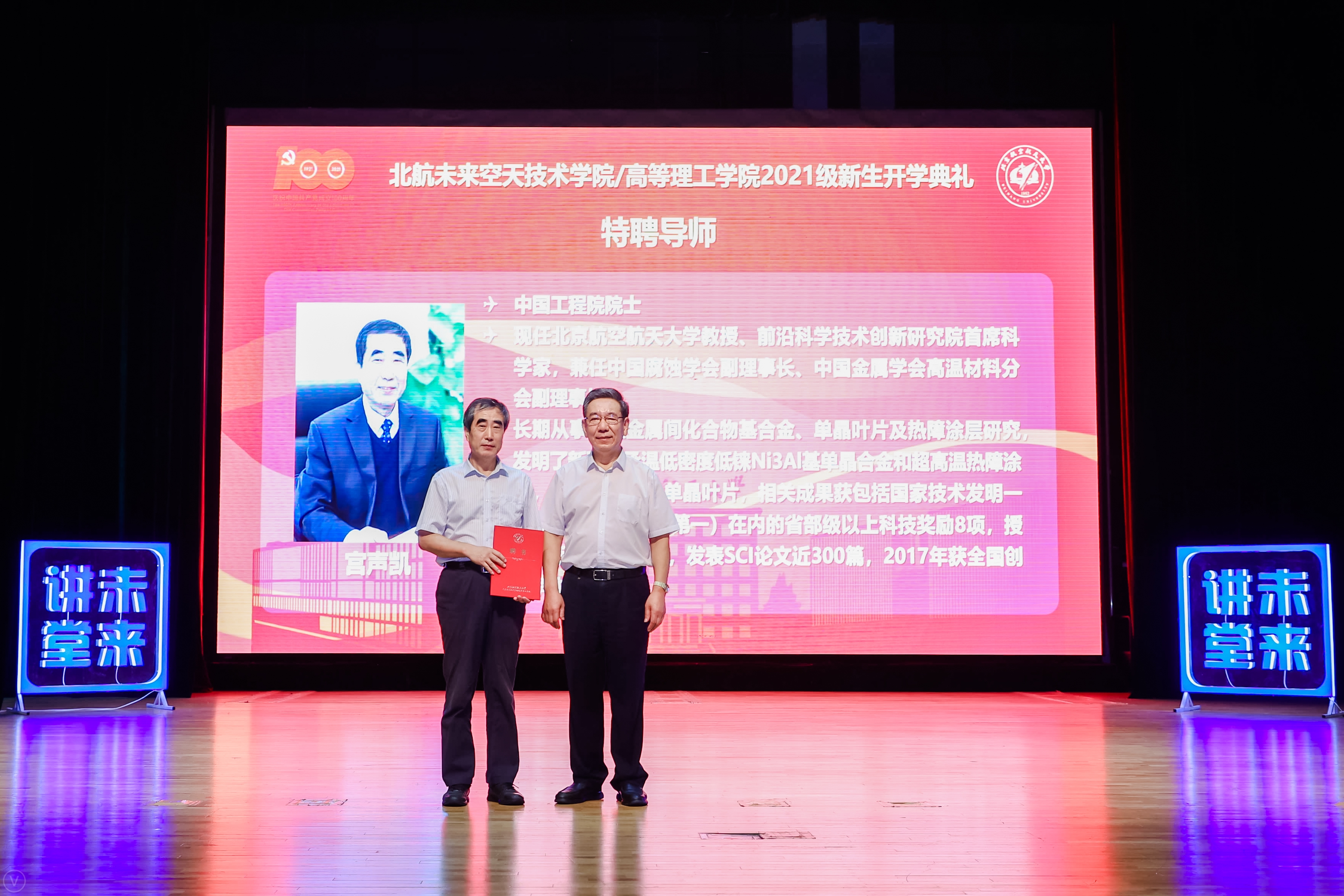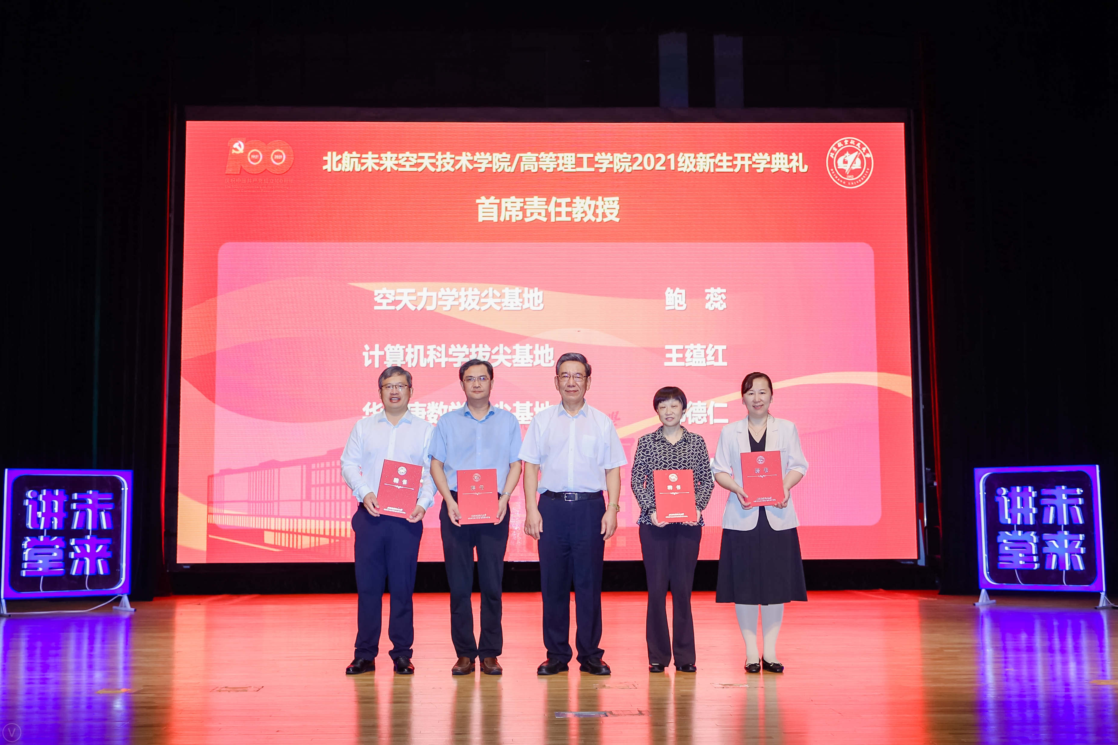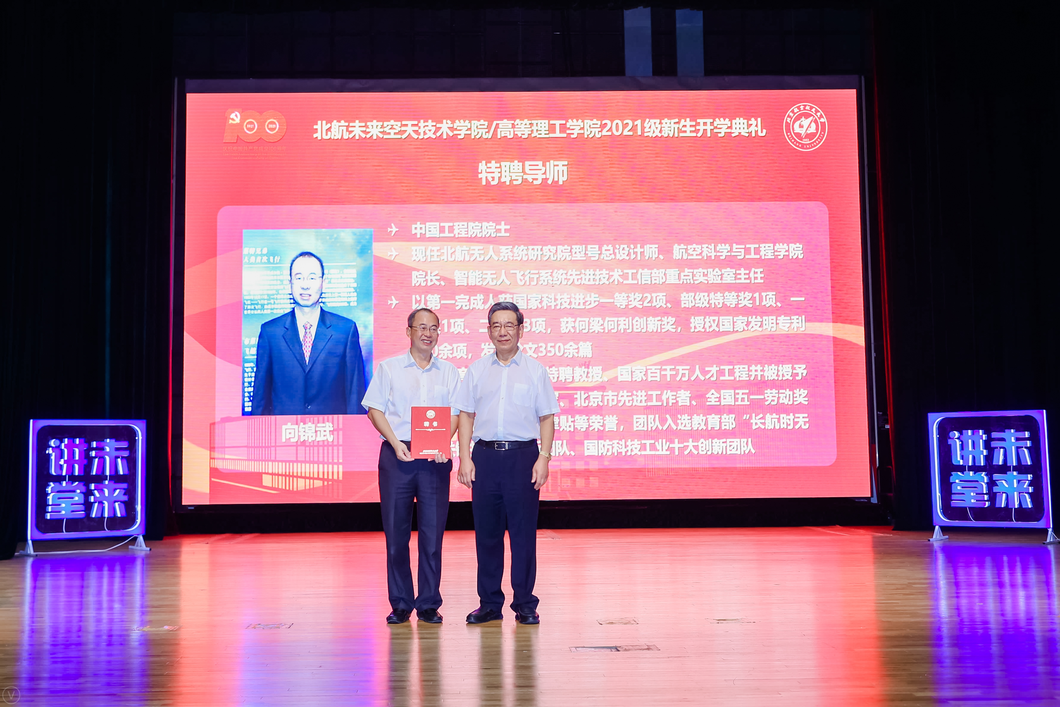 在庄严的国歌声中,开学典礼拉开序幕。吴伟仁院士为北航前沿科学技术创新研究院首席科学家宫声凯院士、苏东林院士和北航无人系统研究院型号总设计师、航空科学与工程学院院长向锦武院士三位首批校内特聘导师颁发了聘书。航空科学与工程学院常务副院长鲍蕊,计算机学院党委书记王蕴红,数学科学学院院长韩德仁,人文社会科学学院院长、人文与社会科学高等研究院院长蔡劲松,分别受聘为空天力学、计算机科学、华罗庚数学三个拔尖计划基地和通识类课程的首席责任教授。