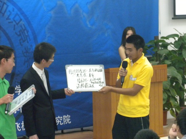 下午二时许,“飞豹杯”决赛缓缓拉开帷幕。短暂的队伍介绍后,紧张又不失趣味的答题环节正式开始。高工的三位选手在答题的整个过程中状态良好,凭借冷静的分析和充实的知识储备顺利通过了比赛“百家争鸣”和“群雄逐鹿”两个环节,跻身最后的“华山论剑”环节。在正赛与航空基础部平手的情况下,他们与航空基础部代表队展开了多场加时赛,并最终取得了二等奖的优异成绩。