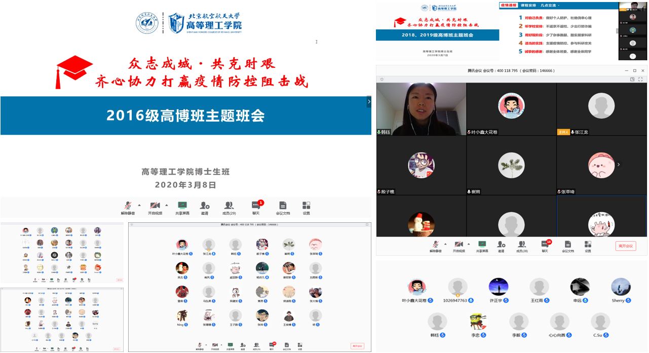 班会中,韩钰副院长进一步明确了学校及学院有关疫情防控工作的要求,对所有同学,尤其是目前仍身处湖北和意大利、德国、美国、新加坡等地的同学表示关心和慰问,并嘱咐他们务必遵守学校要求,做好个人防护及防疫生活物资储备,确保身体健康,保持密切联系。高博班辅导员通报了前期疫情防控信息统计情况,传达了学校关于公派留学、视频答辩、学位审核、毕业就业等教育教学工作最新通知和要求。同学们一一连线发言,介绍了所在区域疫情防控及个人学习科研等方面的情况。班会解答了大家关于疫情防控、在线上课、居家科研等方面的疑问,并收集了同学们对于延期开学阶段各项工作的意见建议。