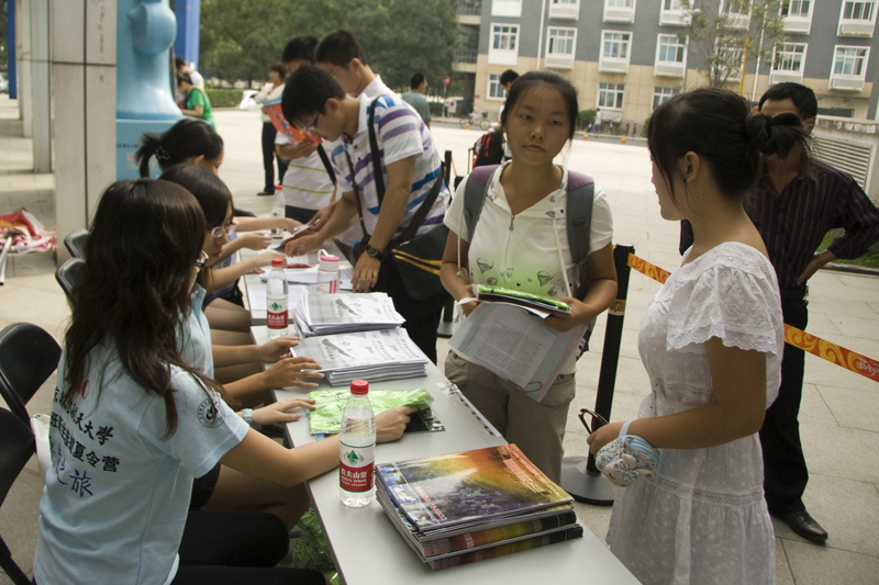 八点半左右,报到工作正式开始,比预计时间提前了半个多小时。签到、分发一卡通、领取手册及营衫:在志愿者的组织协调下,新生报到工作有序进行。此外,报到点还特意设立了咨询处,就家长和学生所关心的食宿安排、选拔活动及新校区情况等问题进行了细致耐心的解答。