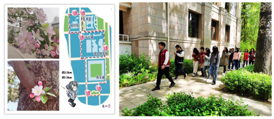 跟随着龙小棠的指引,大步走的队伍从主楼正门出发,经过“北京一号”雕像,走在教学区的林荫路上,欣赏了校园内各处海棠花的标志点。行进在校园中,既增进了教职工交流沟通,促进了学院团队建设,又提高了教职工身体素质。