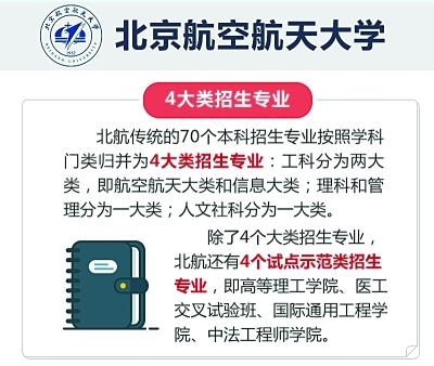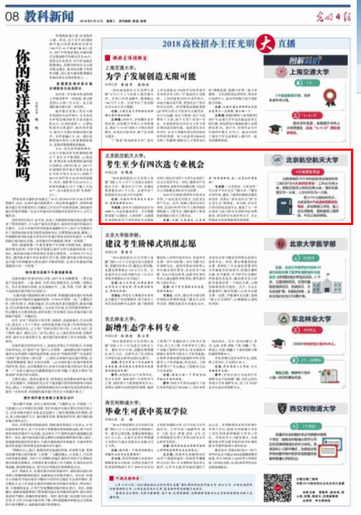 马进喜:2018年北航招生总计划4000人,与去年基本持平。今年将继续采取“大类招生、大类培养”,北航将自身传统的70个本科招生专业按照学科门类归并为四个大类专业和四个试点示范类专业。同时,继续实行专业零调剂,如果考生报满志愿,可以百分之百地满足考生的专业志愿。