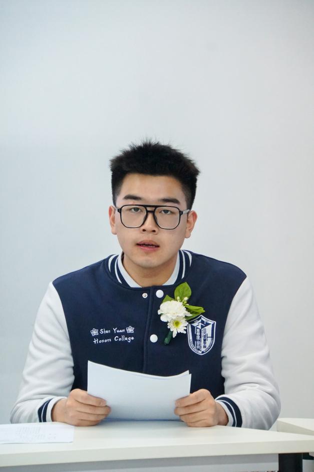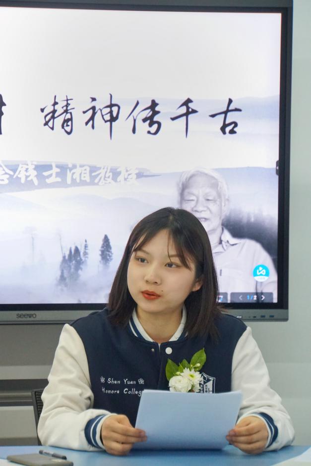 2019级本科生刘子全作为《一生热爱育英才,桃李芬芳扑面来》主创代表带领大家回顾了钱老的生平经历与精神品质,该作品获评教育部关工委2021年“读懂中国”活动优秀短视频、北京市短视频一等奖,北航短视频一等奖以及北航征文二等奖。2018级本科生袁浩宇作为2021年度高等理工学院“钱士湘杨宗智奖学金——公益之星”获得者进行了分享,她受钱老精神的激励,参与研究生支教团,立志到党和人民最需要的地方去,做一个艰苦奋斗、乐于奉献的高工学子。