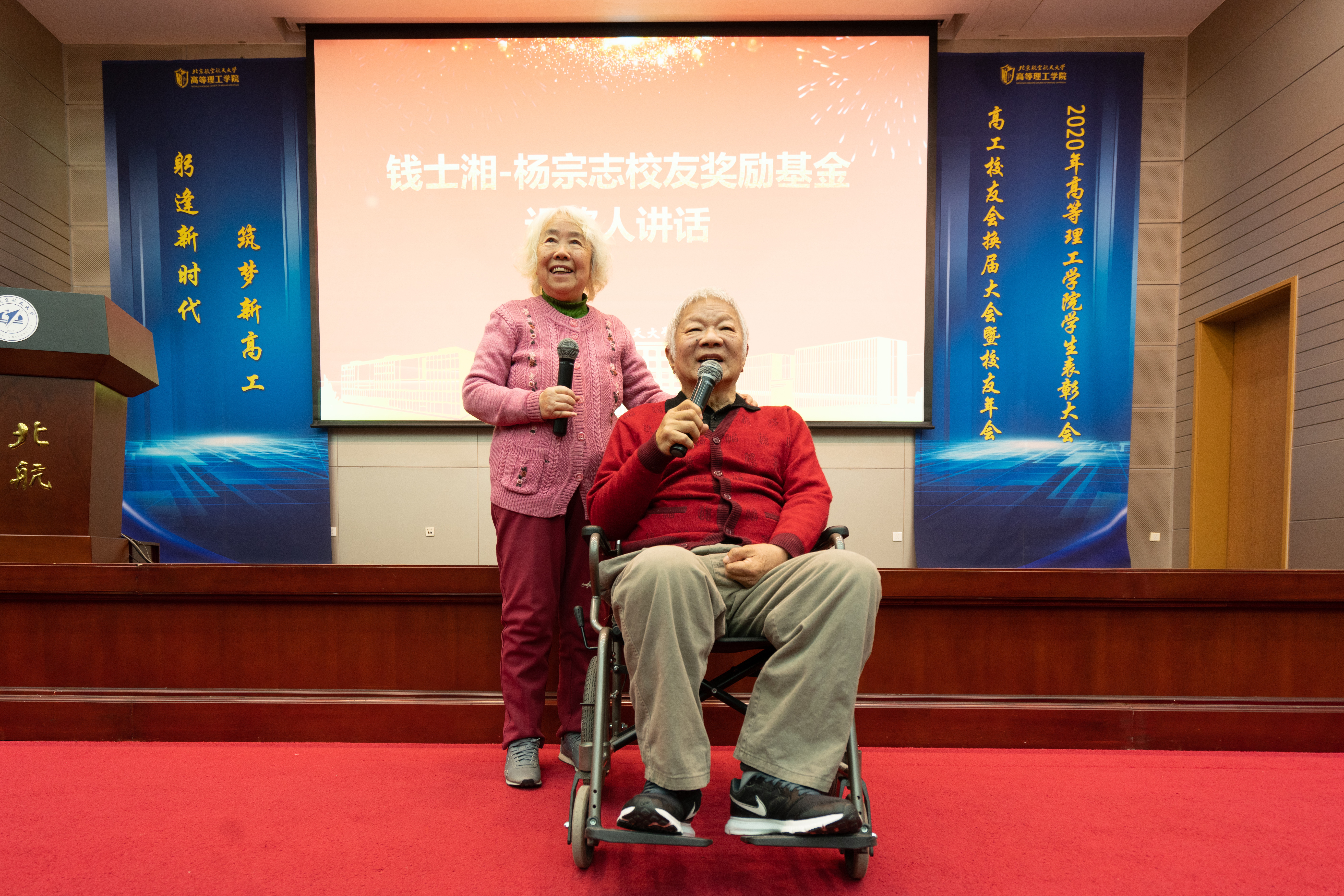 在学院2020年度学生表彰大会上,师生校友共同观看学院宣传片《定义》。钱士湘-杨宗智校友奖励基金捐赠人钱士湘和夫人杨宗智致辞,他们回顾了高工建院初期的点点滴滴,阐释了高工的建院初衷和育人理念,表示将继续尽己所能、投身公益、回馈社会,并寄语广大校友坚守初心,在自我发展的同时不忘反哺母校、薪火相传。钱老、杨老无私的大爱精神感人至深,经久不息的掌声响彻全场。在他们的感召下,校友们纷纷捐赠丰富“钱士湘-杨宗智校友奖励基金”,以实际行动让大爱火种代代不熄,助力学院学生成长成才。