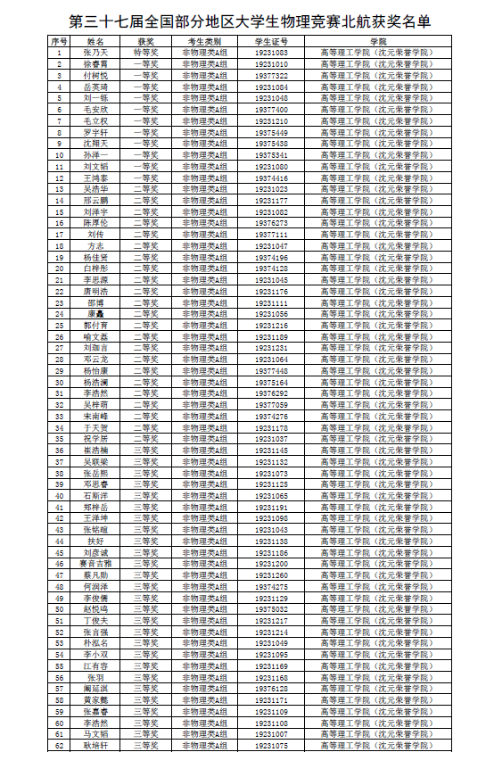 关于第三十七届全国部分地区大学生物理竞赛高等理工学院获奖名单