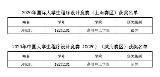 2020年国际大学生程序设计竞赛和中国大学生程序设计竞赛高等理工学院获奖名单如下: