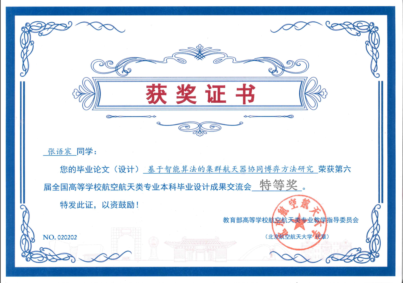 (通讯员 田圆)5月24日,第六届全国高校航空航天类专业本科毕业设计成果交流会在上海交通大学闵行校区举行。我校未来空天技术学院2021级张语宸的《基于智能算法的集群航天器协同博弈方法研究》获特等奖,吴一川同学的《基于机器学习的地月空间非合作目标意图识别》获优秀奖,指导教师均为学院校内导师、宇航学院师鹏教授。