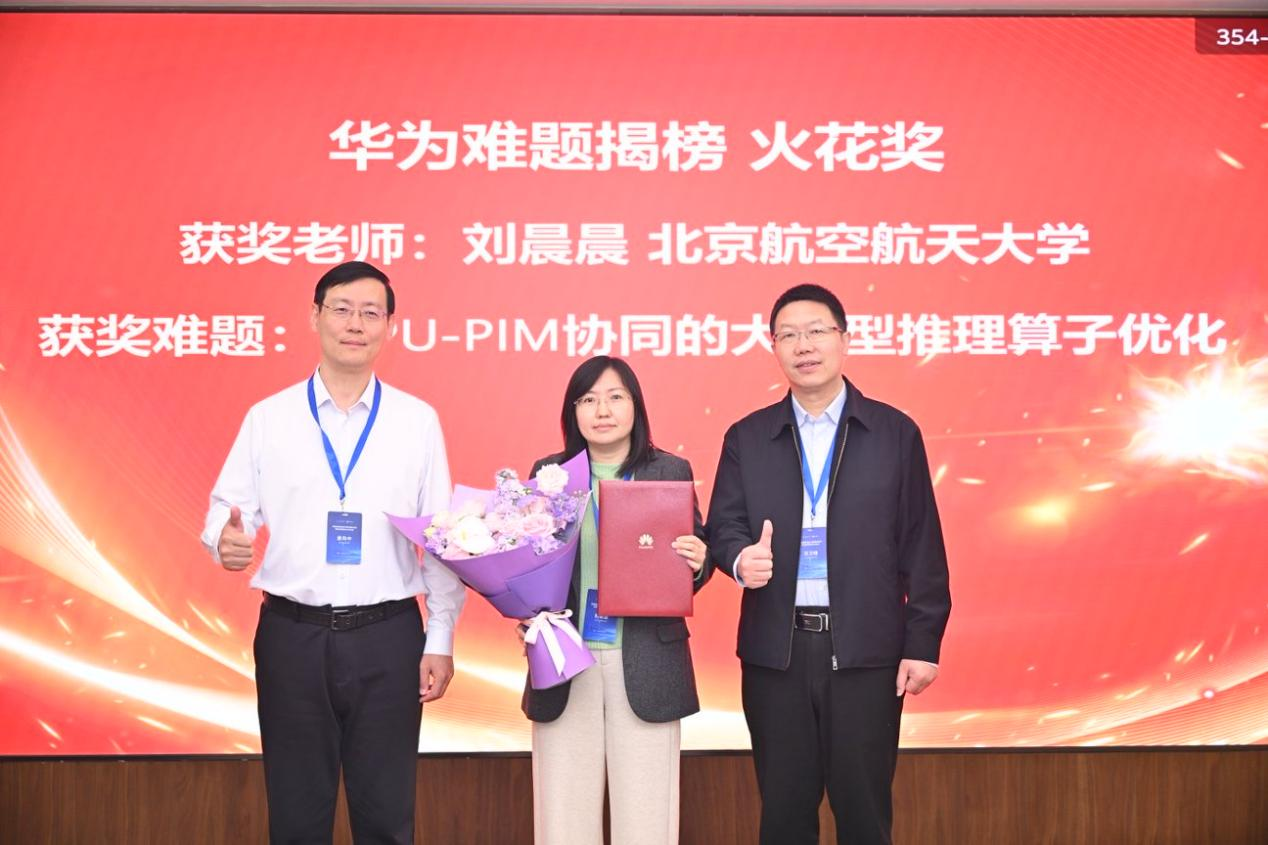 论坛上,北航国家卓越工程师学院副院长徐明详细介绍了学院的卓越工程师培养体系、办学特色与实践成果,全面展现北航在工程人才培养方面的扎实探索。赵礼菁作华为科研合作介绍与难题揭榜分享,发布企业技术攻关实际需求,为校企联合开展科研攻关、定向培养工程人才搭建精准对接桥梁。论坛还举行了华为难题揭榜火花奖颁奖仪式,北航集成电路科学与工程学院教授刘晨晨凭借《NPU-PIM 协同的大模型推理算子优化》课题斩获该奖项,这一成果充分彰显了北航教师在技术攻关与产学研协同创新中的过硬实力。