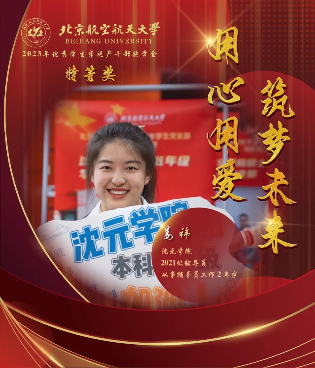 我院2021级辅导员姜祎荣获2023年北航优秀半脱产辅导员特奖